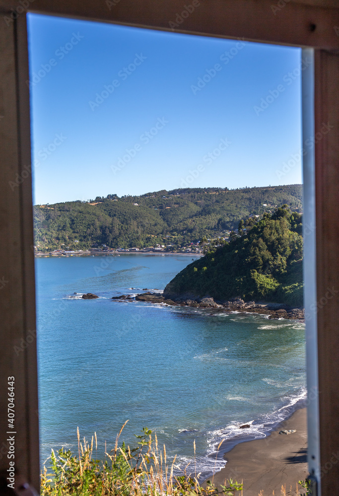 Chilean Pacific coast. Black beach in shuthern Chile. View the Motorhome door