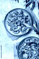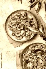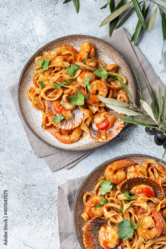 Mediterranean food. Seafood pasta with ostions and shrimps. White background. Top view