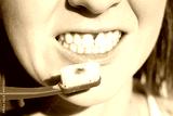 Woman with bleeding gums during teeth brushing. Hard toothbrush problem. Periodontal disease, avitaminosis, gingivitis, scurvy