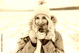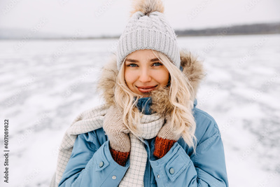 Closeup portrait of a young blonde woman looking at camera, on cold winter day.