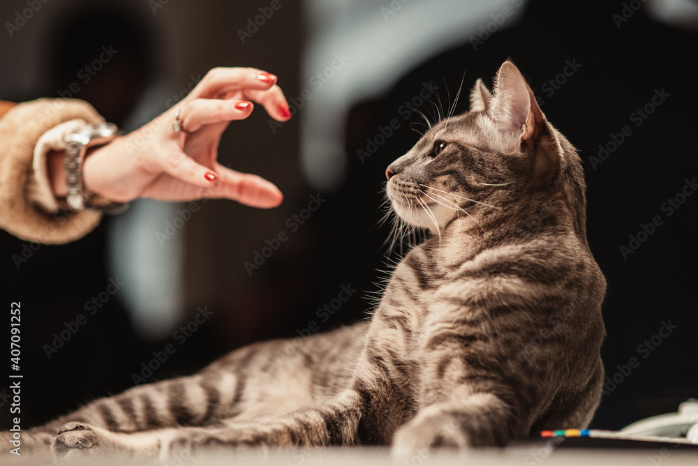 portrait of cat looking at a woman hand making claw in interior space