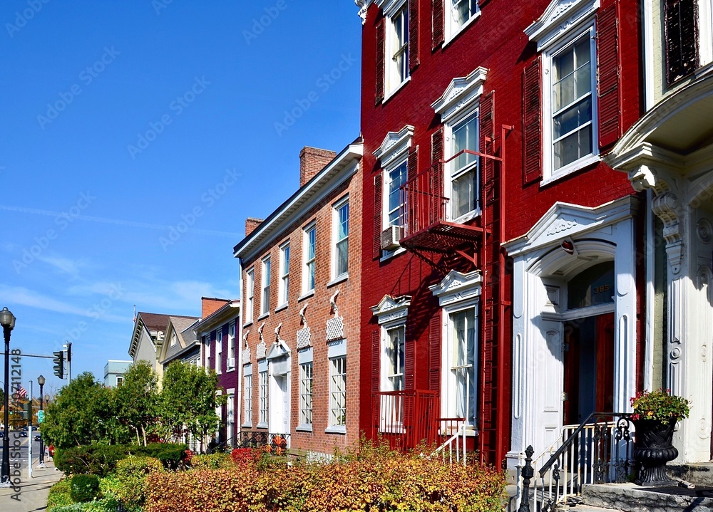 Cityscape of Geneva, New York. Historic row houses in downtown. Well maintained buildings with colorful paintings. A charming small town in America, has been on Playful City USA list.