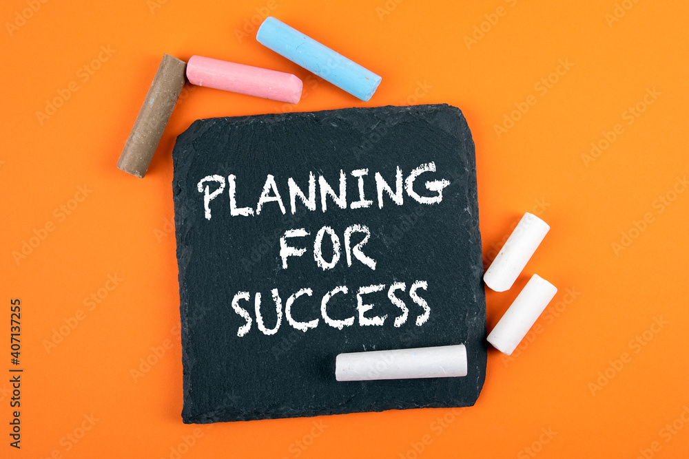 PLANNING FOR SUCCESS. Text on a stone surface. Chalk on an orange background