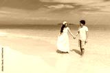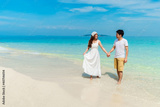 happy young couple walking on sea beach at Koh MunNork Island, Rayong, Thailand