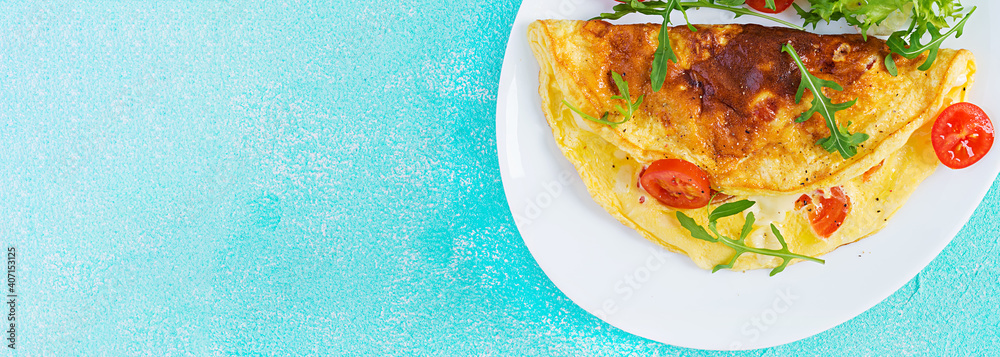 Breakfast. Omelette with tomatoes, cheese and arugula on white plate. Frittata - italian omelet. Ketogenic, keto food. Top view, banner