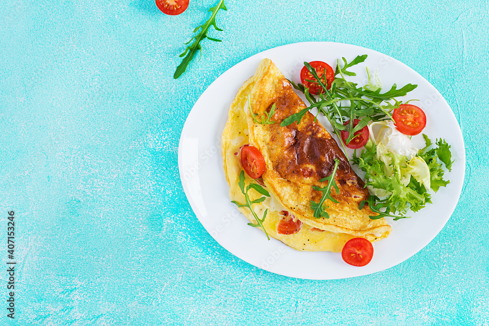 Breakfast. Omelette with tomatoes, cheese and arugula on white plate. Frittata - italian omelet. Ketogenic, keto food. Top view, flat lay