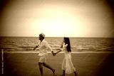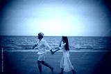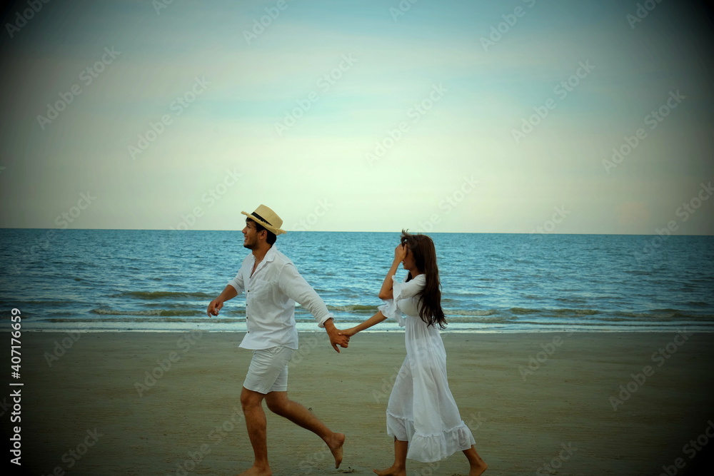 A romantic couple at the beach by the sea have white sand with the sound of waves and sunshine. With activities in the afternoon on a sweet holiday
