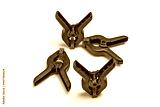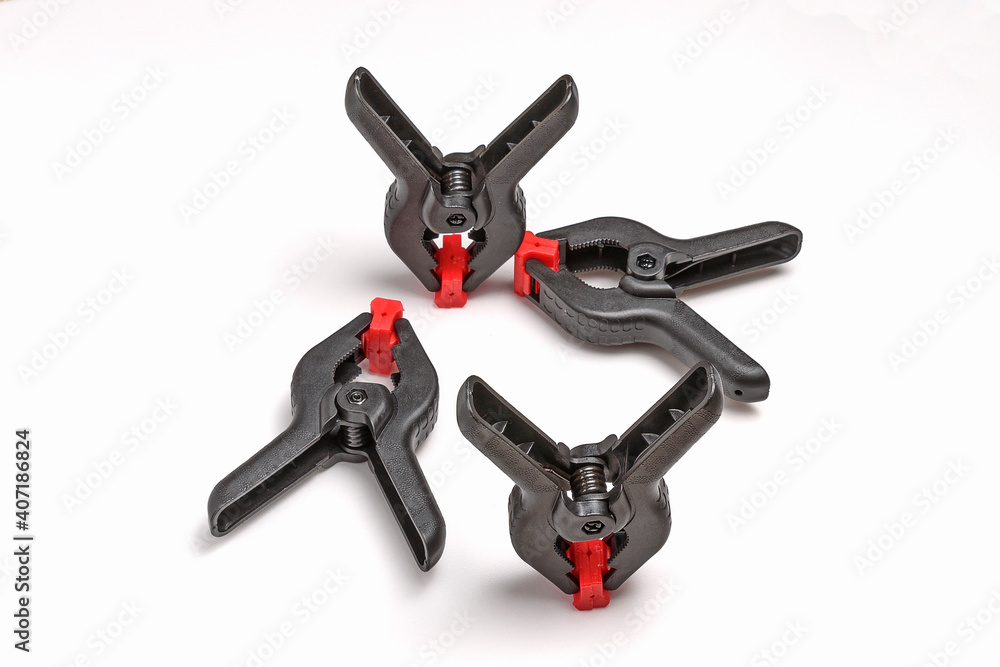 Four spring clamps on a white background close-up