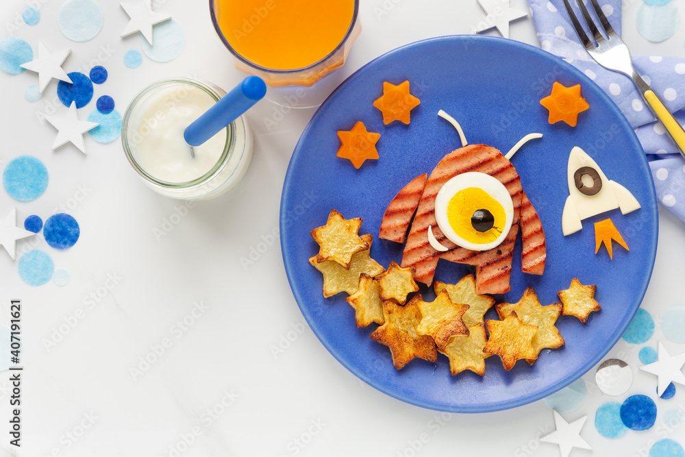 Cute smiling alien shaped hamburger served with roast potatoes, carrots and eggs for a healthy lunch or dinner with yoghurt and orange juice. Fun food for kids