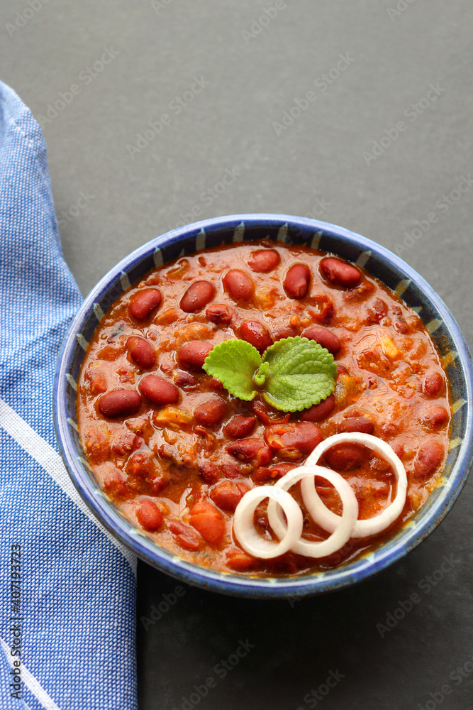 Rajma curry is a popular North Indian Food. Rajma is a socked Red kidney beans cooked with onions, tomatoes and a special blend of spices. Served with Jeera rice or Cumin Rice. With Copy Space.