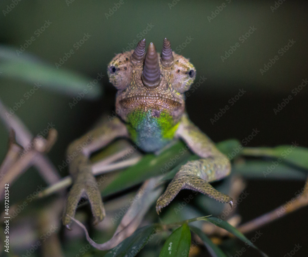 close up of young jackson chamaleon (trioceros jacksonii) in its natural habitat in urban nairobi