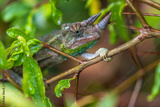 close up of young jackson chamaleon (trioceros jacksonii) in its natural habitat in urban nairobi