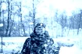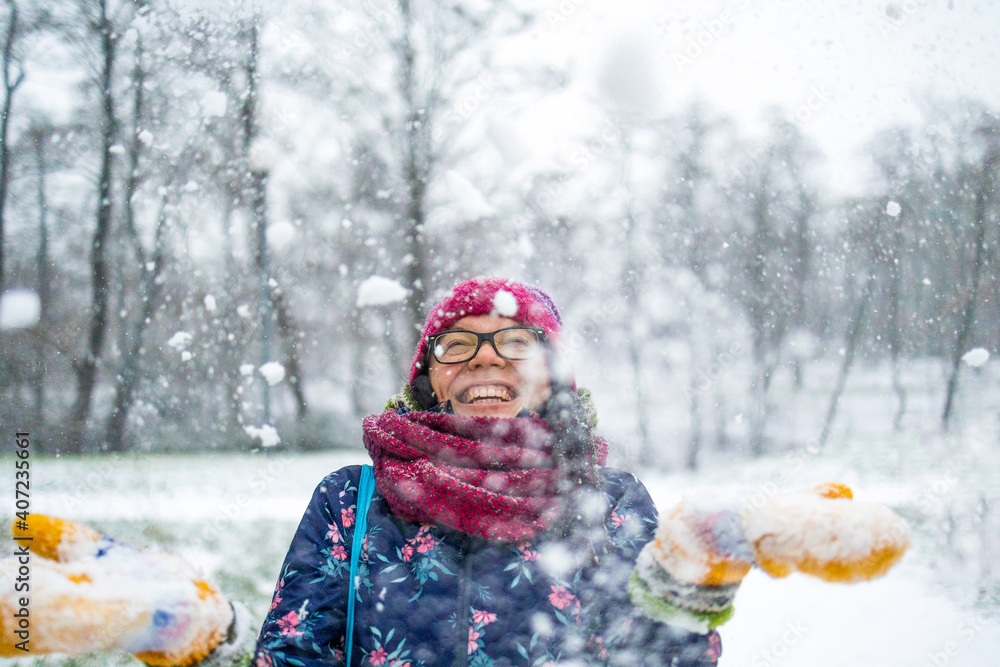 Woman throwing snow in the air and enjoying a cold winter day
