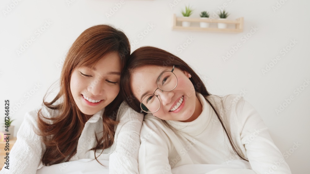 Homosexual Asian women lesbian couple lying on the bed looking at the camera. LGBT friendship concept