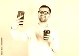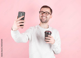 Portrait of a fashionable handsome bearded young hipster blogger in a white sweatshirt posing and taking a selfie on the phone while tasting coffee. Indoor, isolated, studio shot, pink background