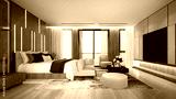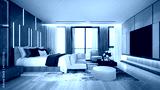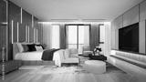 Modern bedroom interior mock up, wooden rattan bed on empty marble wall background, Scandinavian style, 3d render