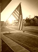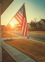 American flag outside residential home at dawn