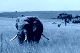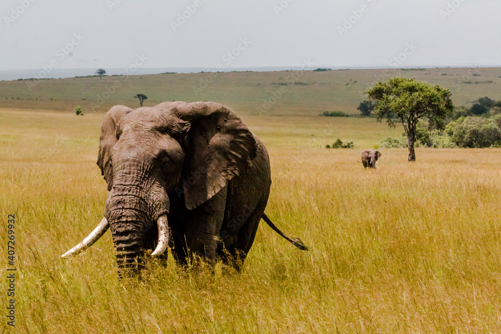 large elephant bull in african savannah with big tusks with acacia tree in background