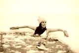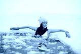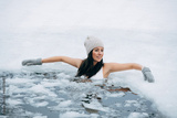 Winter swimming. Woman in frozen lake ice hole. Swimmers wellness in icy water. How to swim in cold water. Beautiful young female smiling. Gray hat and gloves swimming clothes. Nature lake in forest