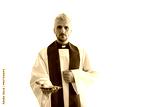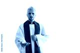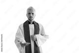 Catholic priest holding american money dollars in his hand. Isolated on white background