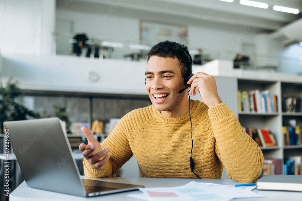 Successful hispanic freelancer, manager or tutor sitting at work desk wearing headphones communicate and smiling while video conference with colleagues or students
