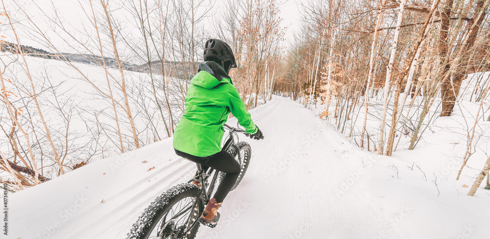 Fat bike winter sport biker cyclist biking girl riding on snow trail. Outdoor sport in nature forest background panoramic landscape.