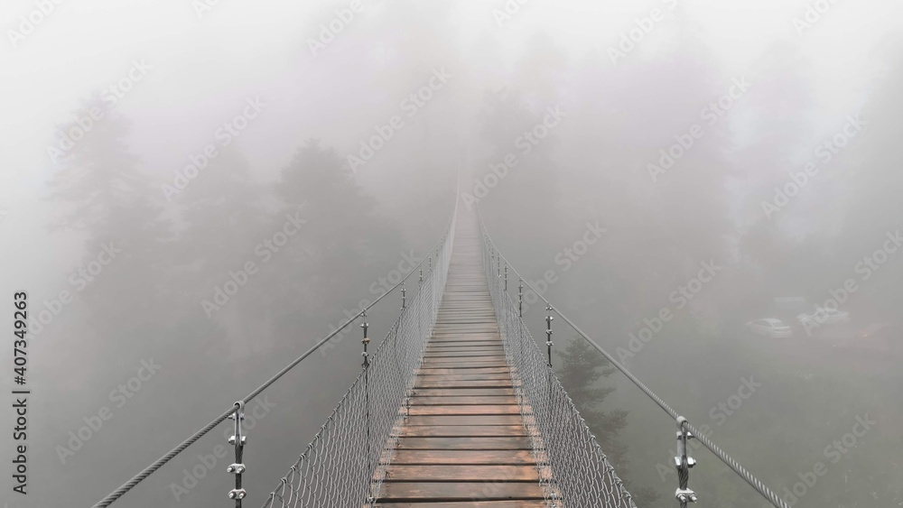 Suspension bridge in mountain, Fog Oaxaca Mexico