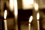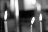Festive and religious concept: There are three candles but the focus is on a single yellow candle in the middle with hot flame. Blurry background