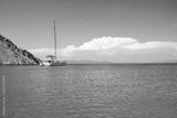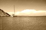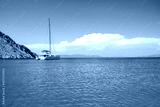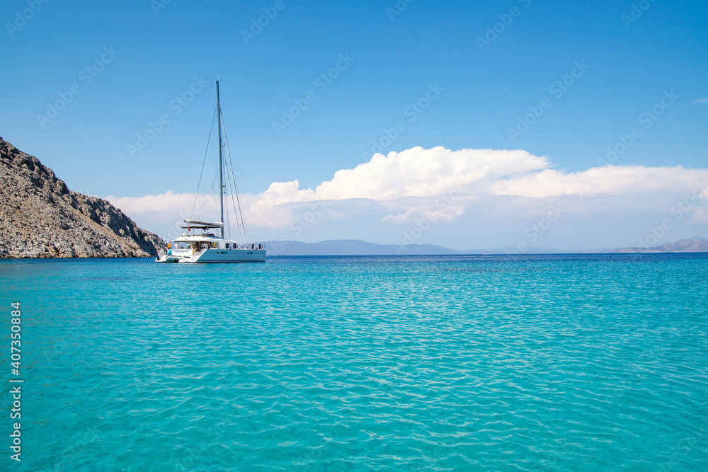 Sailing boat anchored in a turquoise color wonderful sea bay.