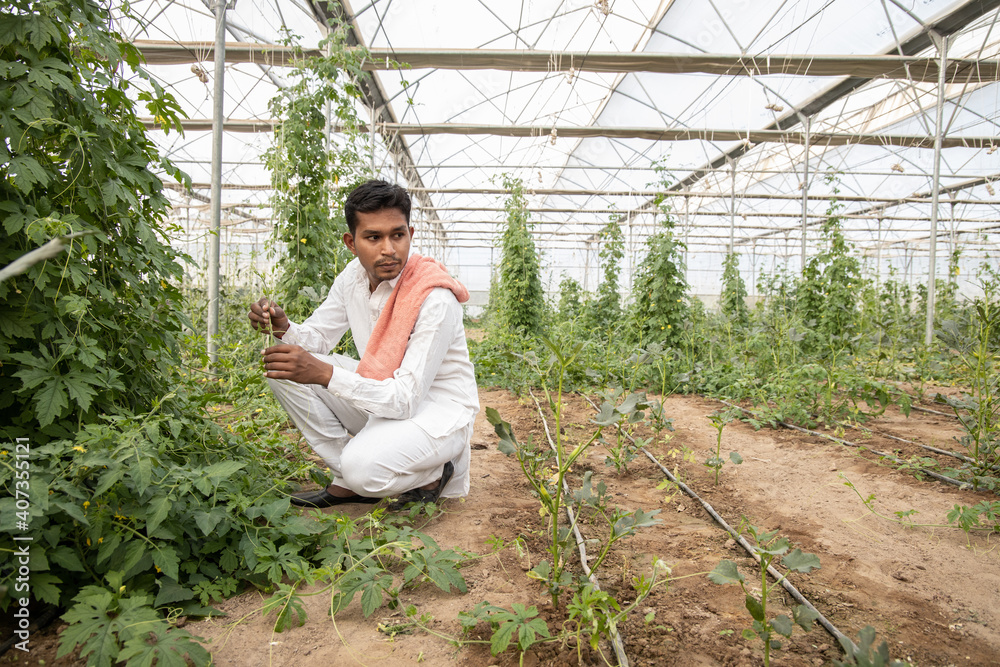 Young indian farmer inspecting crop from his poly house or greenhouse, modern organic farming, agriculture concept, copy space.