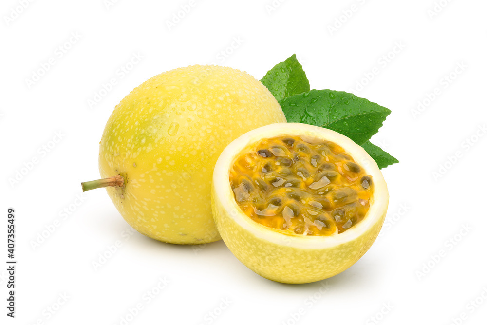 Yellow passion fruit with cut in half and green leaf isolated on white background..