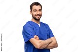 healthcare, profession and medicine concept - happy smiling doctor or male nurse in blue uniform with crossed arms over white background