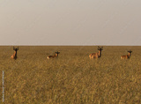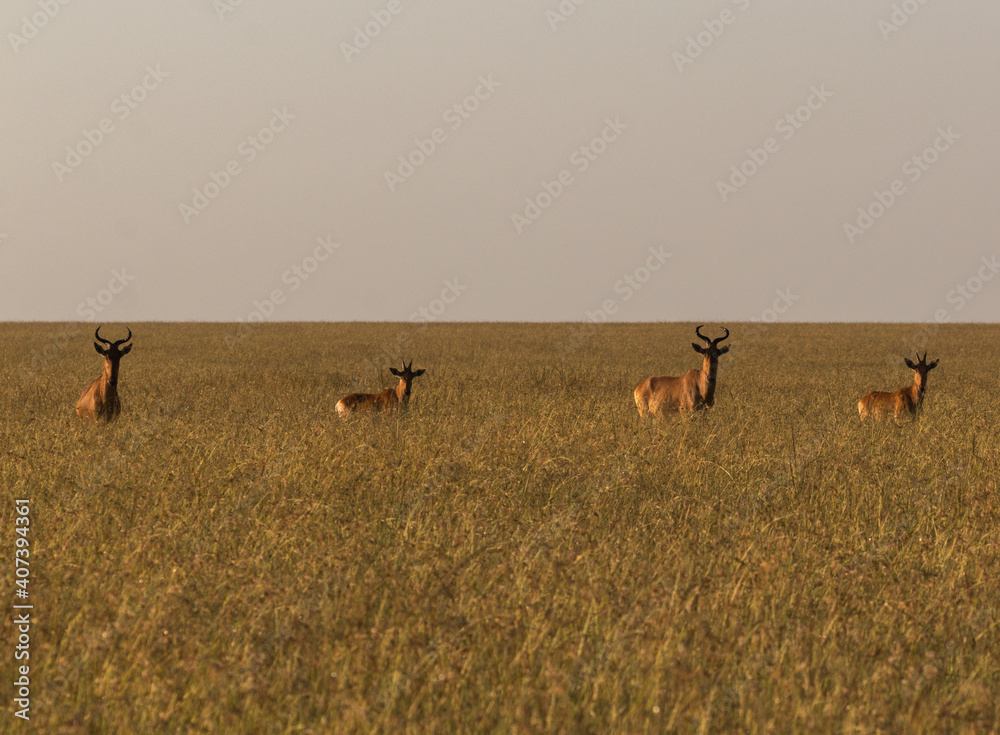 hartebeest family standing in savannah during sunrise (masai mara)