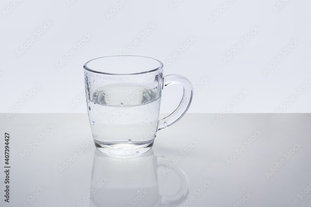 Transparent glass mug with water on light reflective surface