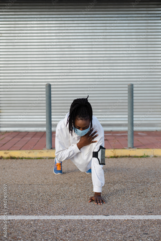 Sporty woman doing plank shoulder tap strength exercise. Female fit athlete training wearing face mask during Covid-19 pandemic.