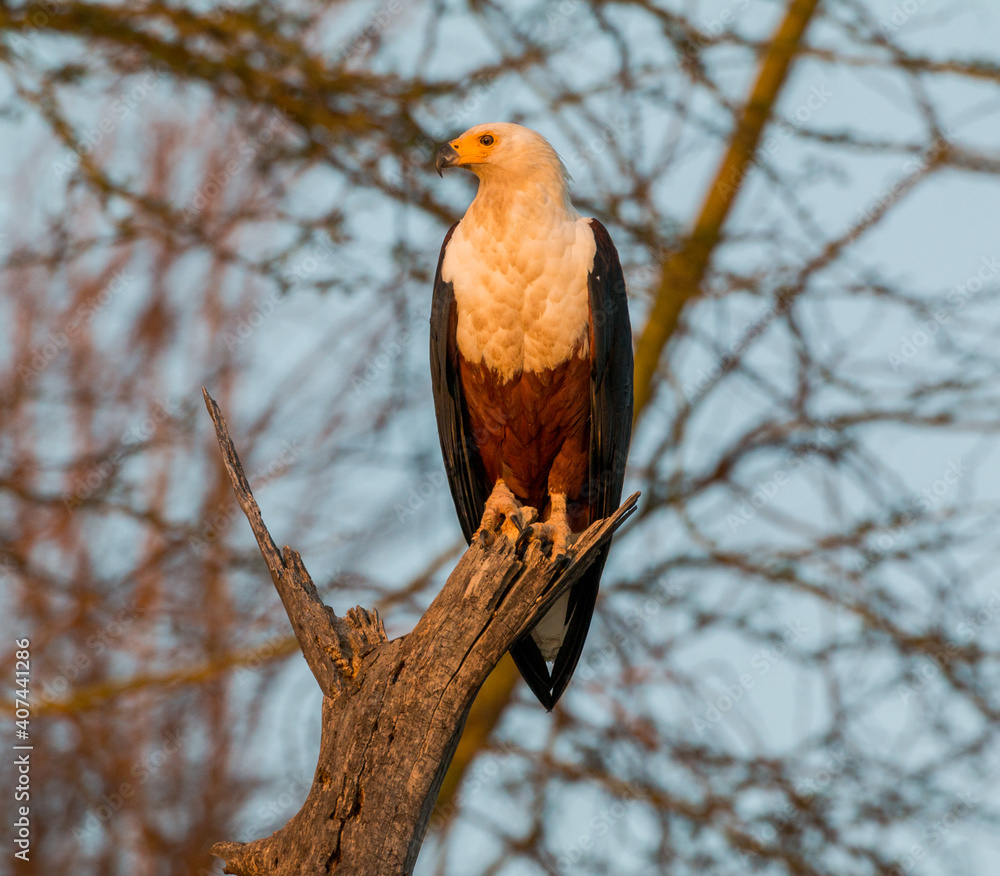 african fish eagle sitting on branch during sunrise