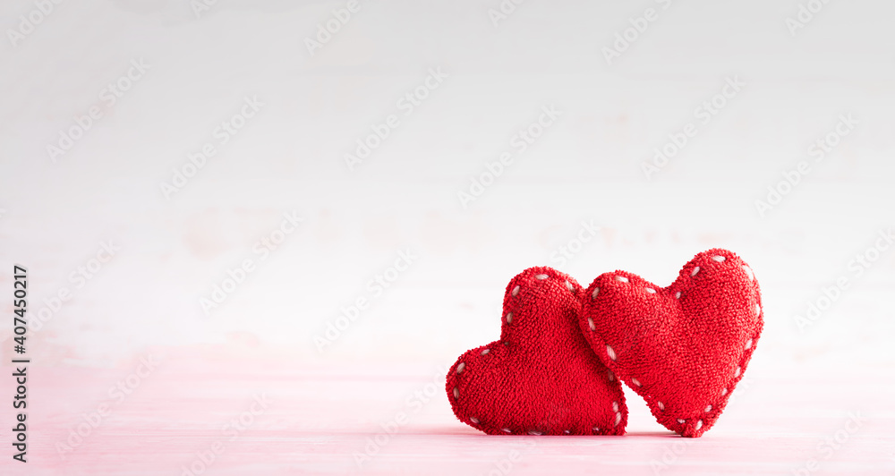 Two handmade red heart on bright wooden background. The symbol of love, couple and Valentine's day concept