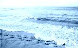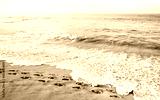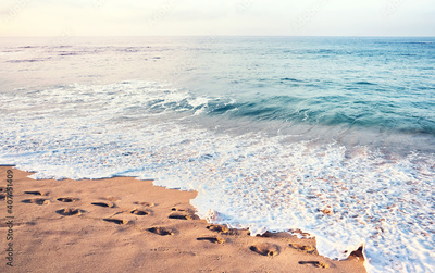 Footprints on a sandy tropical beach at sunset, color toning applied.