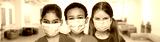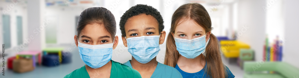 Multiethnic group of kids wearing medical masks standing in a school corridor. Global pandemic, quarantine at school