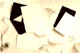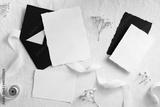 Black envelopes and white paper cards with flowers and ribbon on textile background. Flat lay, top view. Wedding flat lay composition.