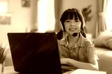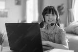 Asian girl student video conference e-learning with teacher and classmates on computer in living room at home. Homeschooling and distance learning ,online ,education and internet.