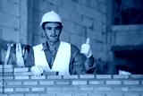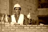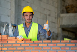 Bricklayer industrial worker installing brick masonry on exterior wall at new house.