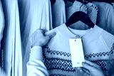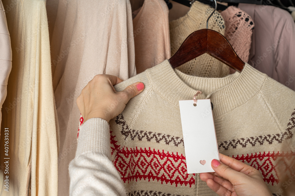 Woman customer looking on tag choosing sweater with christmas ornament in garment store. Shopping. Winter