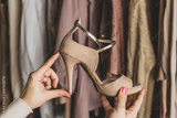 Woman shopper, customer measuring high-heeled shoes choosing footwear, clothes from assortment of female garment store. Shopping.