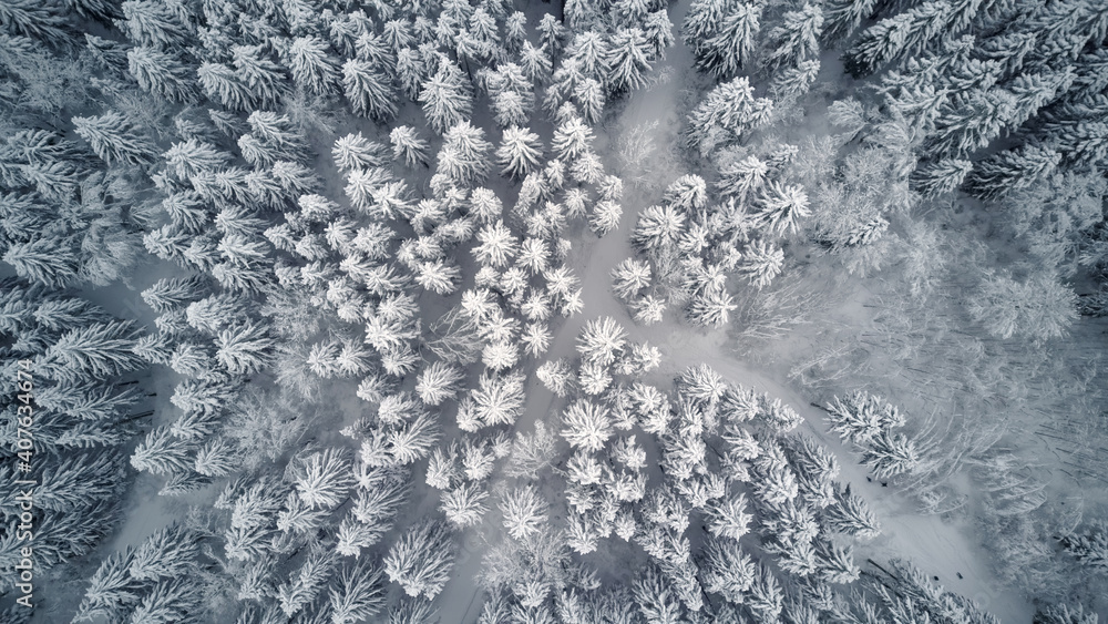 Drone view of a beautiful fairy-tale snow-covered forest on a winter day, top view