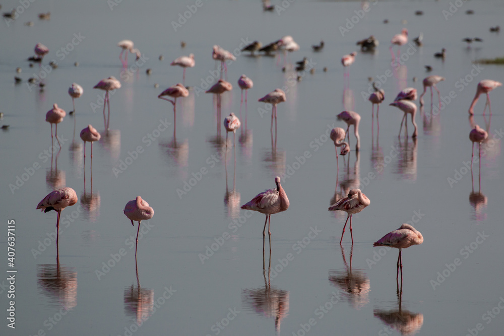 flock of greater and lesser flamingo with their reflections in the water in sub saharan africa