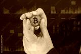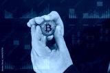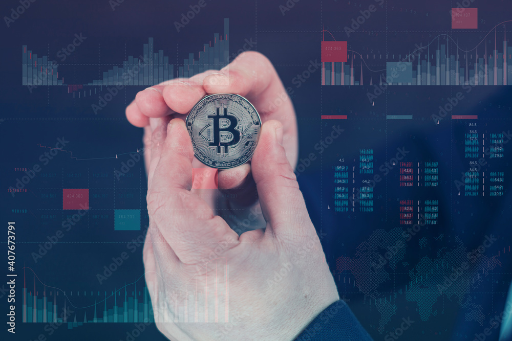 Businessman holds a gold bitcoin coin in his hands. Information holographic panel with statistics shows the fall and growth of the cryptocurrency. Virtual currency and blockchain concept.