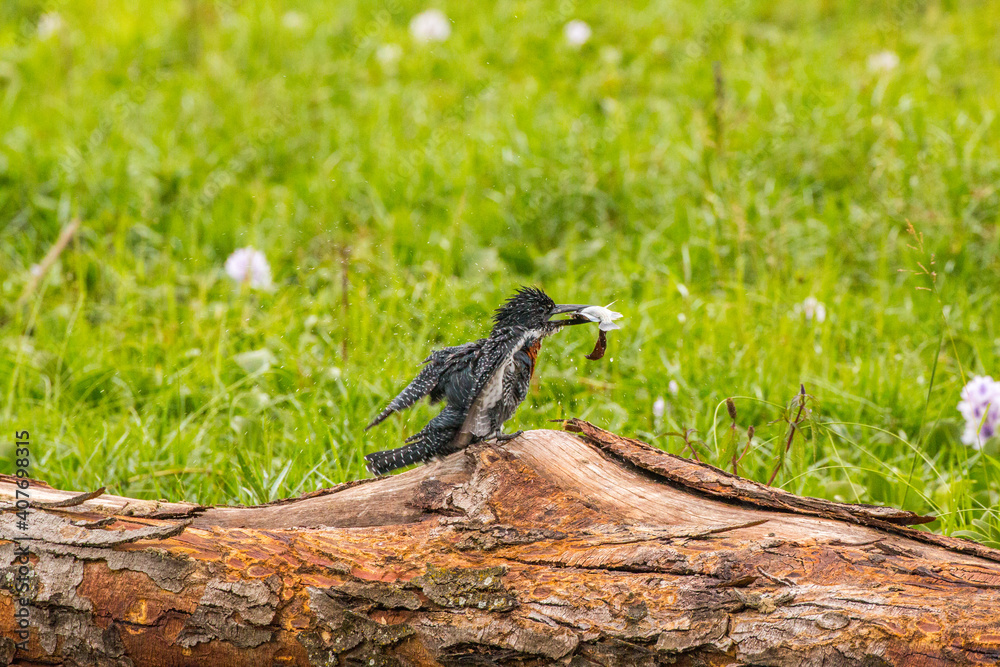 giant kingfisher with caught fish in its peak
