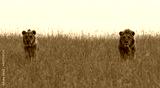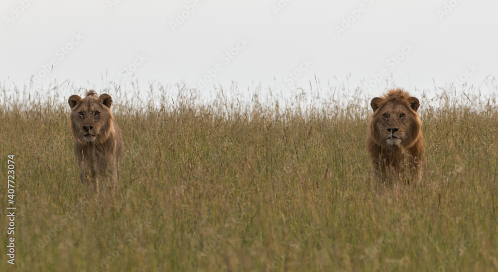 scenic lion brothers in natural environment on territorial march (masai mara)
