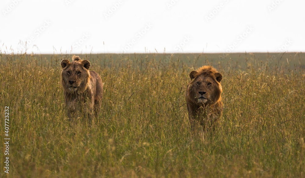 two male lion brothers in savannah looking out of the grass on search for prey in african wilderness (masai mara)